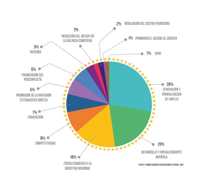 Dado que el tema económico es uno de los grandes desafíos del país, los congresistas expresaron cuales son los temas que consideran deben ser abordados por la agenda legislativa en el próximo periodo, en donde se destacan: generación y formalización del empleo con 28%, desarrollo y fortalecimiento agrícola 20% y fortalecimiento a la industria nacional 16%.
