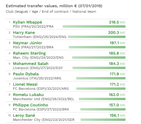 Una de las gratas sorpresas en ranking de los talentos del fútbol más caros del mundo es la aparición del francés figura del Paris Saint Germain, el jugador de 20 años de edad encabeza el ranking con un monto de 218.5 millones de euros, seguido por Harry Kane del Tottenham, el brasileño Neymar del PSG, Raheem Sterling del Manchester City, entre otros.