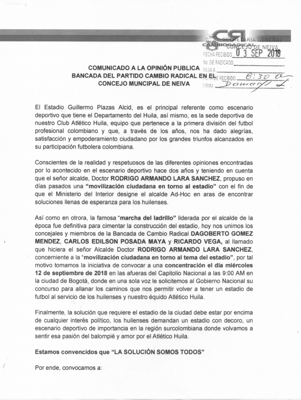Luego de que el pasado viernes 17 de agosto el alcalde de Neiva Rodrigo Lara motivara a que la ciudadanía se movilizara hasta Bogotá para solicitar en instancias nacionales que el Ministerio del Interior designe un alcalde Ad-Hoc con aras de encontrar una solución a la problemática del estadio Guillermo Plazas Alcid la Bancada del Partido Cambio Radical en Neiva emitió un comunicado el lunes en el que toma la iniciativa para que el día miércoles 12 de septiembre se realice a las afueras del Capitolio Nacional desde las 9:00 a.m en Bogotá una concentración para solicitar al gobierno nacional su agilidad para el inconveniente que no se ha solucionado hace dos años.