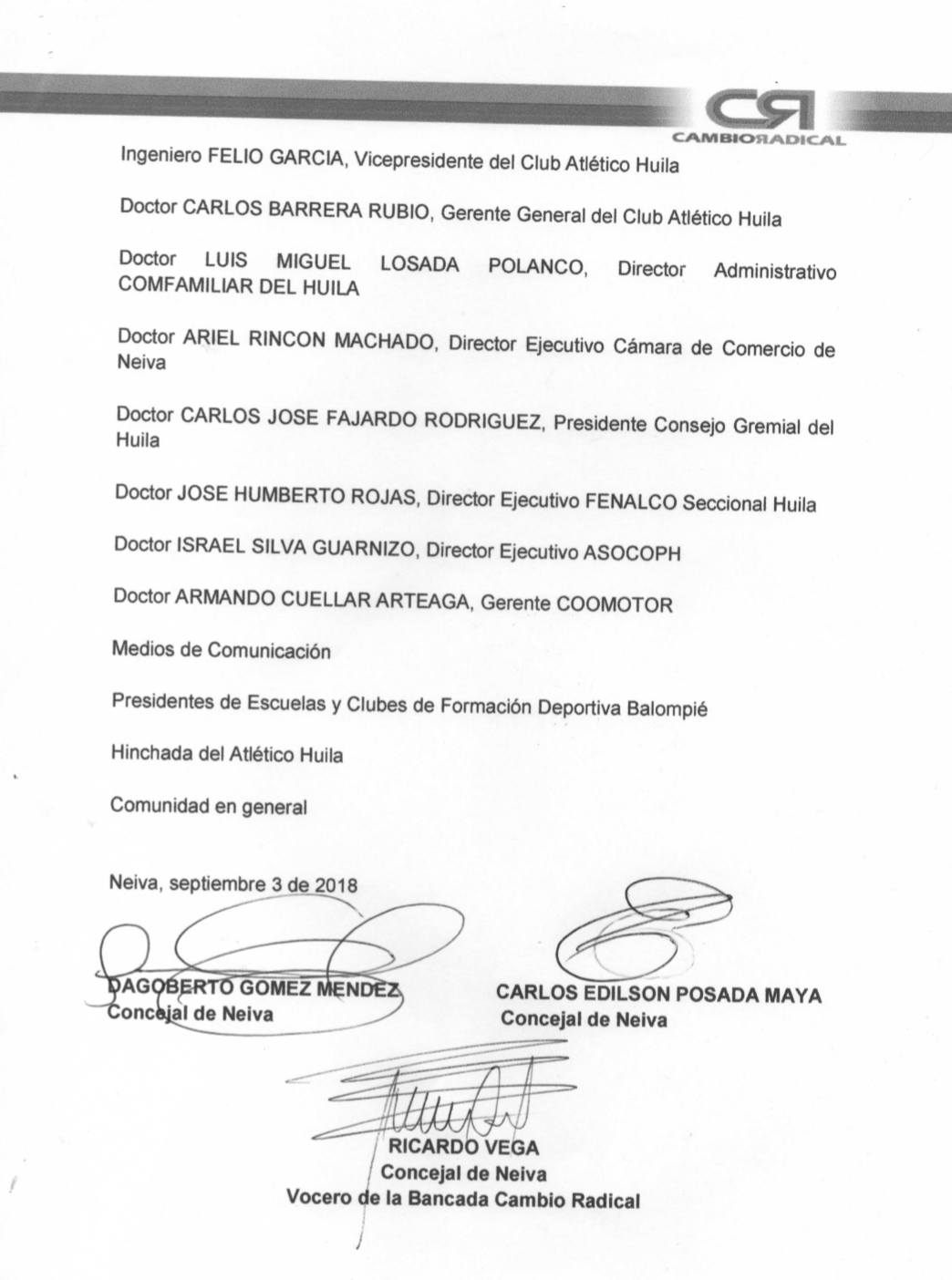 En el comunicado se destaca: “por encima de cualquier interés político, los huilenses demandan un estadio con decoro, un escenario deportivo de importancia en la región Surcolombiana donde volvamos a sentir esa pasión del balompié y amor por el Atlético Huila” luego enuncia la convocatoria a senadores, representantes a la cámara, gobernador del Huila, entes deportivos, concejales, medios, hinchas y comunidad a unir esfuerzos y poder incentivar a quienes le compete la solución del inconveniente del escenario deportivo en Neiva.