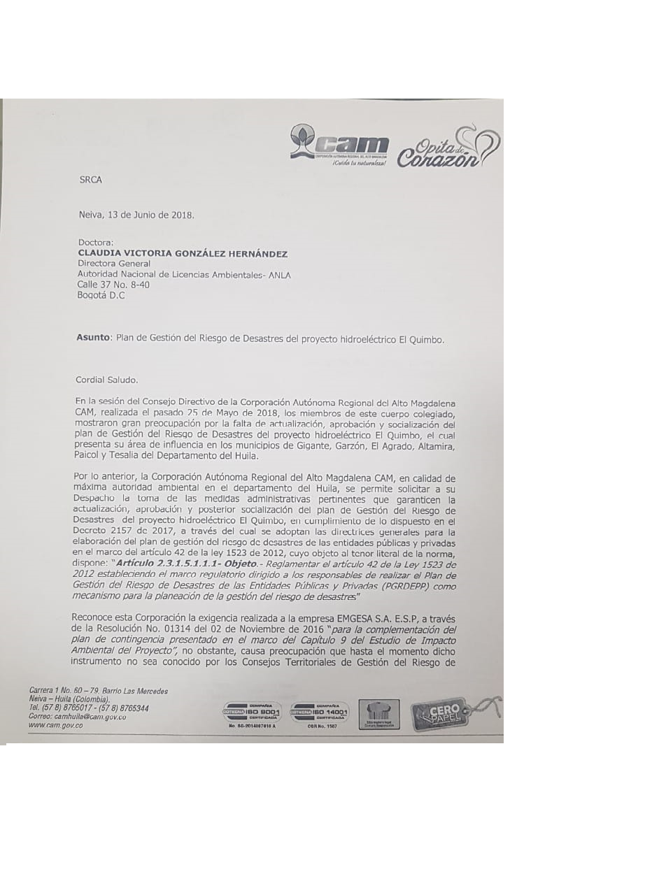 Luego de analizar la situación que se ha suscitado en los últimos días con relación a posibles filtraciones en El Quimbo, el Consejo Directivo de la Corporación del Alto Magdalena CAM, elaboró el pasado 13 de junio una carta la cual fue enviada a la directora de la ANLA, exigiéndole a través de esta entidad que Emgesa, entregue el Plan de Gestión de Desastres de la presa.