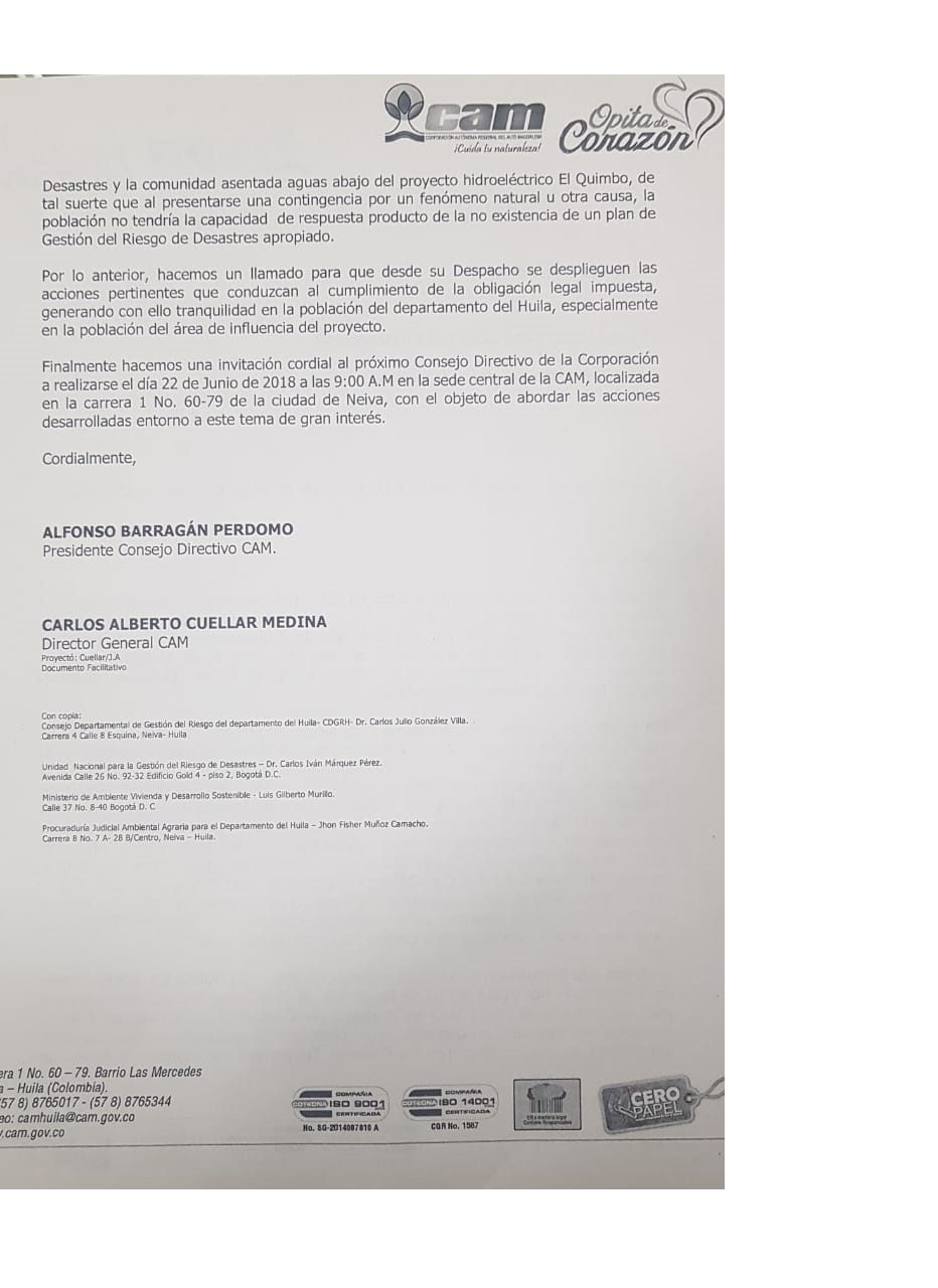 Esta carta enviada a la ANLA, deja claro que la multinacional Emgesa no ha cumplido con la actualización del Plan de Contigencia De desastres desde hace tres años, tal como lo aseguró en una entrevista concedida la semana anterior a Caracol Radio Neiva, el director de la CAM Carlos Alberto Cuellar.