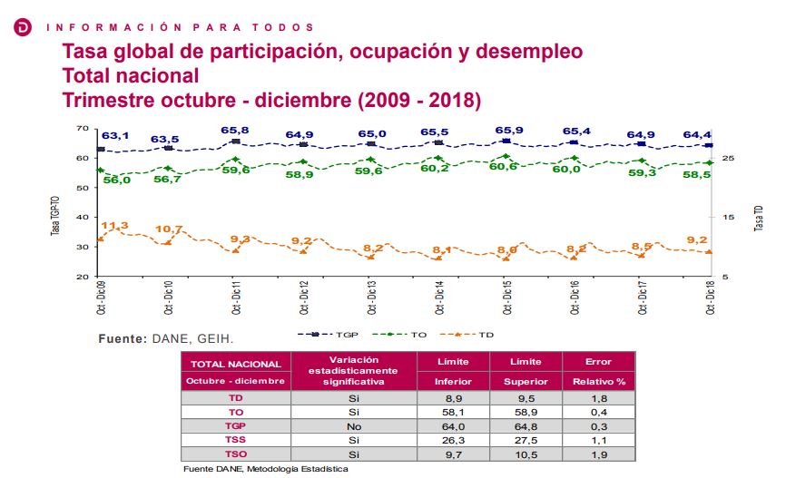 La tasa de desempleo nacional del trimestre octubre - diciembre 2018 fue 9,2%, lo que representó un aumento de 0,7 puntos porcentuales respecto al mismo trimestre de 2017 (8,5%). La tasa de ocupación se ubicó en 58,5%, lo que significó una disminución de 0,8 puntos porcentuales al compararlo con el trimestre octubre - diciembre de 2017 (59,3%).