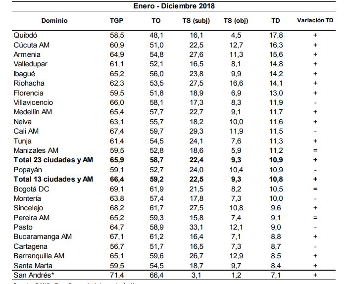 Para 2018 la tasa de desempleo en el total de las 13 ciudades y áreas metropolitanas fue 10,8%, la tasa global de participación 66,4% y la tasa de ocupación 59,2%. Para el 2017 se ubicaron en 10,6%, 67,0% y 59,9%, respectivamente.
