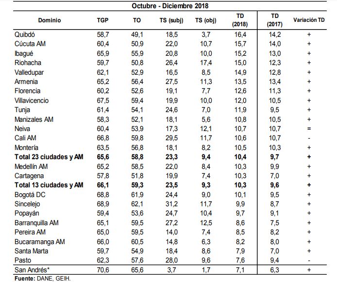 En diciembre de 2018 la tasa de desempleo en el total de las 13 ciudades y áreas metropolitanas fue 10,7%, la tasa global de participación 66,4% y la tasa de ocupación 59,3%. Para el mismo mes de 2017 se ubicaron en 9,8%, 66,6% y 60,1%, respectivamente.