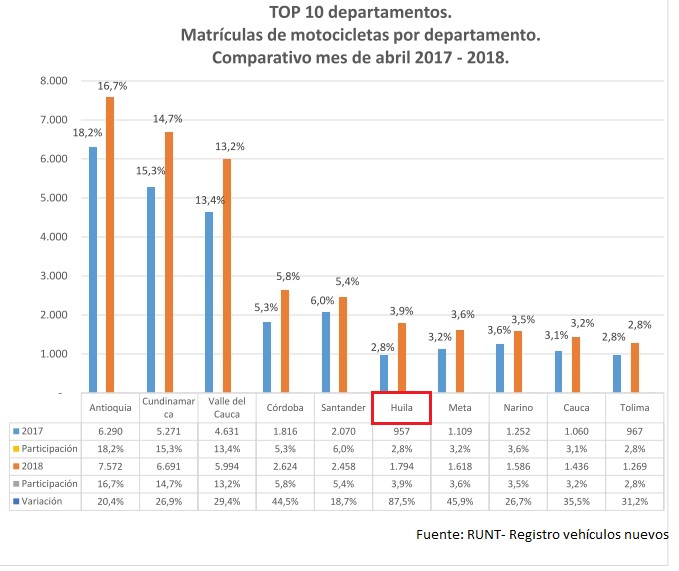 El abril se matricularon en el Huila 1.794 motocicletas nuevas, en el mismo mes de 2017 fueron 957 unidades nuevas registradas, lo cual constituye una variación del 87,5%.