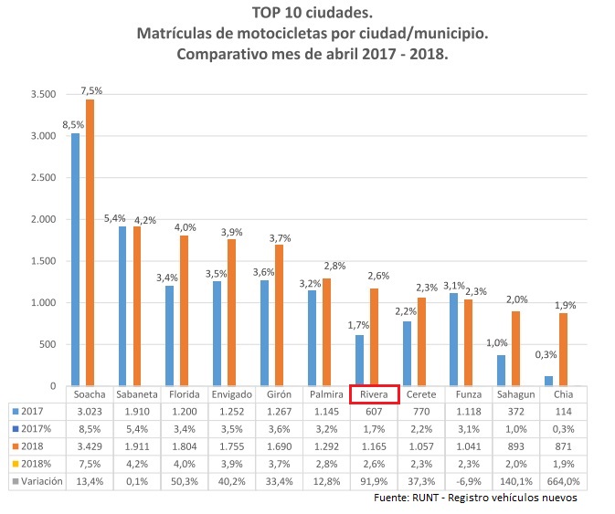 En el caso del Huila, en abril se matricularon en Rivera 1.165 motocicletas nuevas, alcanzando una participación en el mercado de 2,6%, en el mismo mes de 2017 fueron 607 unidades registradas con una contribución en el mercado 1,7%, lo cual constituye una variación del 91,9 %.