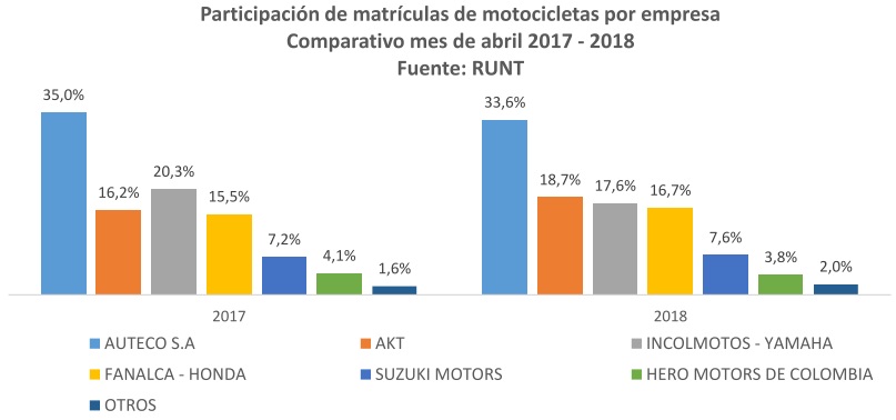 La participación en el mercado por empresa en abril de 2018, respecto del mismo mes en el año anterior se distribuyó así: AUTECO con las marcas (Bajaj, Kymco, Kawasaki, KTM y Victory) mantiene el primer puesto, y pasa del 35,0% al 33,6% de participación; AKT con las marcas (AKT, TVS y Royal Enfied) obtiene el segundo puesto al pasar de 16,2% al 18,7% de participación; INCOLMOTOS – YAMAHA pasa al tercer lugar representando el 17,6% de participación; FANALCA - HONDA ocupa el cuarto lugar y aumenta un punto porcentual respecto a 2017 pasando del 15,5% al 16,7%; SUZUKI cuenta con el 7,6% de participación y HERO obtuvo un 3,8% de participación en el mercado.