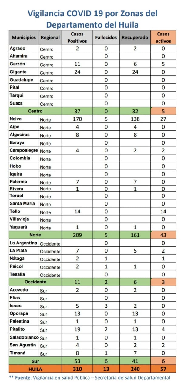 Con el reporte entregado ayer por parte de las autoridades de salud nacional, el departamento del Huila, sumó 10 contagios de coronavirus. A la fecha, ya el Huila tiene 310 casos de coronavirus confirmados y un total de 240 pacientes recuperados.