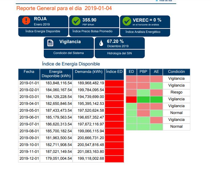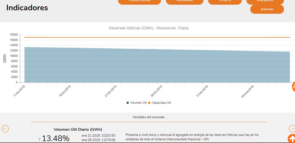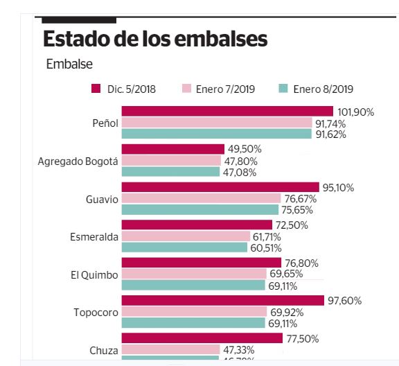 Y es que las últimas semanas de diciembre de 2018 y las dos primeras de 2019 se ha registrado un intenso verano que ha derivado en el descenso en poco más del 11% en el nivel de los embalses, los cuales representan más del 70% de la matriz en el sistema de generación de energía en el territorio nacional.