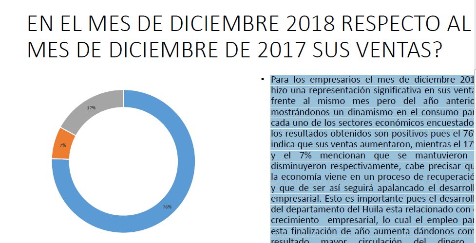 Según José Humberto Rojas, Director Ejecutivo de Fenalco –Huila, para los empresarios el mes de diciembre 2018 hizo una representación significativa en sus ventas frente al mismo mes pero del año anterior, mostrándonos un dinamismo en el consumo para cada uno de los sectores económicos encuestados, los resultados obtenidos son positivos pues el 76% indica que sus ventas aumentaron, mientras el 17%yel 7% mencionan que se mantuvieron y disminuyeron respectivamente.