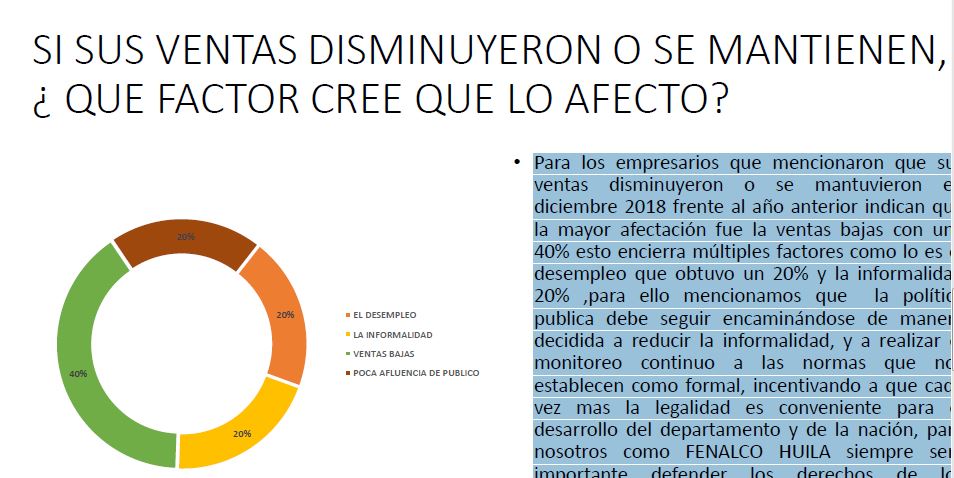 El documento indica que para los empresarios que mencionaron que sus ventas disminuyeron o se mantuvieron en diciembre 2018 frente al año anterior señalan que la mayor afectación fue la ventas bajas con una 40% esto encierra múltiples actores como lo es el desempleo que obtuvo un 20% y la informalidad 20%.