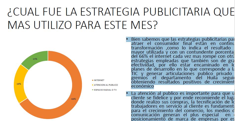 - Bien sabemos que las estrategias publicitarias para atraer el consumidor final están en continua transformación, como lo indica el resultado la mayor utilizada y con un contundente porcentaje del 66% el internet cada vez más rompe con otras estrategias empleadas que también son de gran efectividad, por ello estar encaminado en los planes de desarrollo en lo que corresponde a las TIC y generar articulaciones publico privado y gremios el departamento del Huila seguirá obteniendo resultados positivos de crecimiento económico.