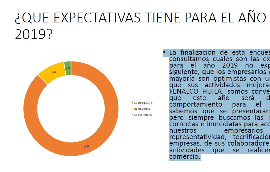 - La finalización de esta encuesta donde consultamos cuales son las expectativas para el año 2019 nos expresan lo siguiente, que los empresarios en su gran mayoría son optimistas con un 88% de que sus actividades mejoraran, para Fenalco-Huila, somos convencidos de que este año será de buen comportamiento para el comercio, “sabemos que se presentaran altibajos pero siempre buscamos las respuestas correctas e inmediatas para acompañar a nuestros empresarios con representatividad, tecnificación de las empresas, de sus colaboradores y demás actividades que se realicen en el comercio”, puntualizó José Humberto Rojas, Director Ejecutivo de Fenalco –Huila.