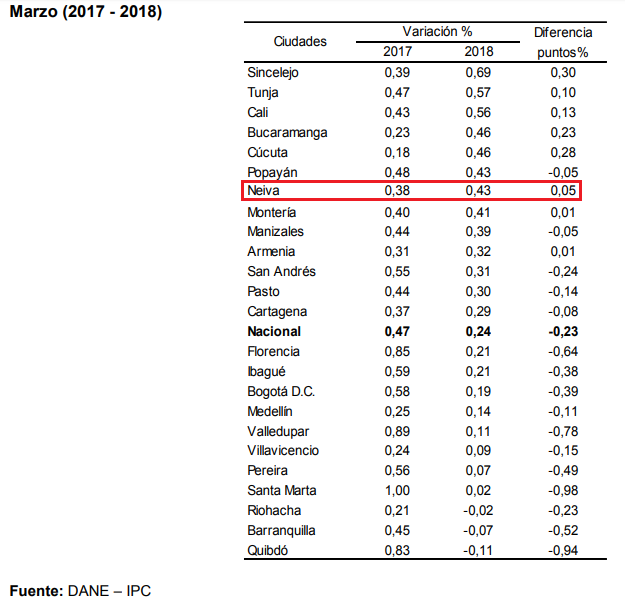 En marzo el IPC, en la capital del Huila fue de 0,43%, cifra superior 0,05 puntos porcentuales (pps) frente al mismo mes de 2017. Esta variación fue la séptima más alta del país y se ubicó por encima de la media nacional, que alcanzó un guarismo de 0,24%.