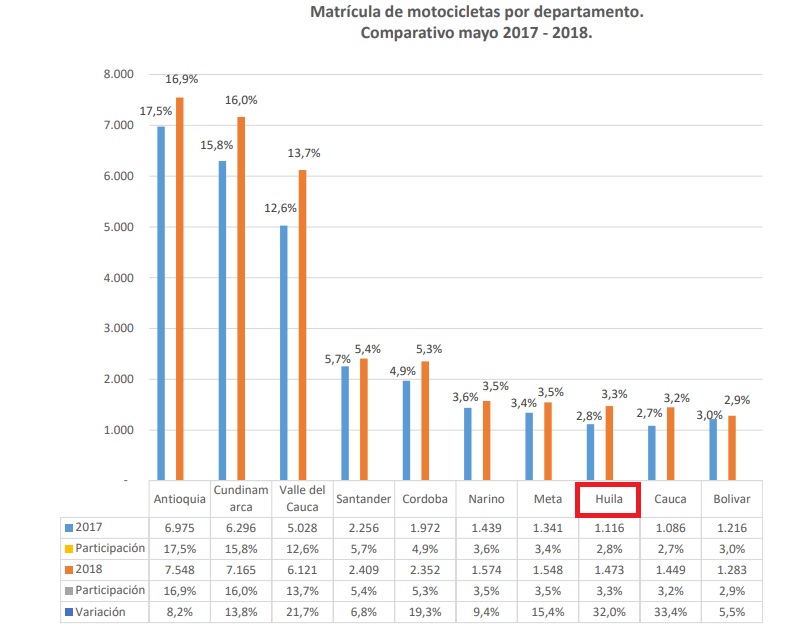 En el caso del Huila, en mayo se comercializaron 1.473 motocicletas nuevas, en el mismo mes de 2017 fueron 1.116 unidades registradas, lo cual representa una variación del 32,0%.