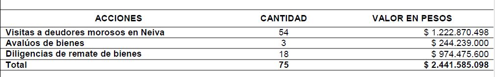 De la misma forma, se conoció que la DIAN-Neiva, adelantará 54 visitas de investigación de bienes a contribuyentes morosos de los principales corredores comerciales para poder recuperar gran parte del dinero adeudado. Además se informó que recaudos por $433.955 millones a octubre realizó la entidad, con un crecimiento de 6,2%, respecto al mismo período de 2017, en el que se logró recaudar la suma de $408.517 millones. La mayor contribución a la variación del período corresponde al recaudo por concepto de Retención en la Fuente a título de renta, IVA y Timbre.