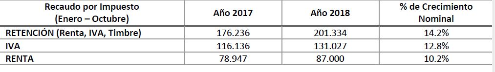 La mayor contribución a la variación del período corresponde al recaudo por concepto de retención en la fuente a título de renta, IVA y timbre, al mostrar un crecimiento nominal de 14.2% pasando de $176.236 millones en el período enero – octubre de 2017 a $201.334 millones en igual período de 2018, El impuesto de IVA obtuvo un recaudo de $131.027 millones en 2018 representando una variación del 12.8% frente al mismo período de 2017 en el que se recaudaron $116.136 millones.
