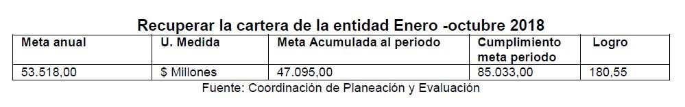 Con la ejecución de los Planes de Cobro y de Control a la evasión y el contrabando, así como las Jornadas Integrales de Control y Servicio, “Al día con la DIAN le cumplo al país”, se han adelantado en el transcurso del año acciones, que hasta el 31 de octubre arrojan una gestión por recuperación de cartera de $85.033 millones, habiendo cumplido con la meta anual de $53.518 millones. Esto es un cumplimiento del 180,55%.