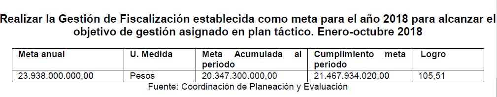 La gestión realizada por la División de Fiscalización para el cumplimiento de acciones integrales e innovadoras de control y fiscalización para reducir la evasión, la elusión y el contrabando, a octubre de 2018 fue de $21.468 millones, habiendo cumplido con la meta acumulada del periodo de $20.347 millones, lo que corresponde a un cumplimiento del 105,51%.