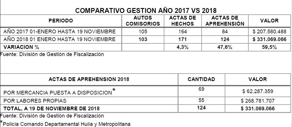 Para la ejecución del Plan de Control a la Evasión y el Contrabando, la Dirección Seccional de Impuestos y Aduanas de Neiva al 19 de noviembre de 2018 llevó a cabo las siguientes acciones de aprensión de mercancías especialmente de relojería, calzado, confecciones, perfumería, celulares, cigarrillos, entre otras.