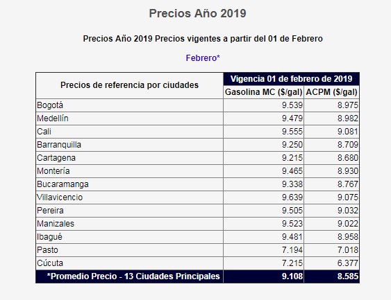 El alza en los combustibles locales se produjo como consecuencia directa del incrementó en los precios internacionales del petróleo, que en diciembre de 2018 fue de 53 dólares por barril y en enero de 2019, de 61 dólares. A nivel nacional la gasolina $39 y Acpm $104, reveló el Ministerio de Minas y Energía. Por su parte, los camioneros rechazaron el incremento en el costo de los combustibles en el país.