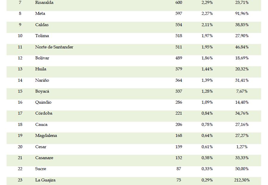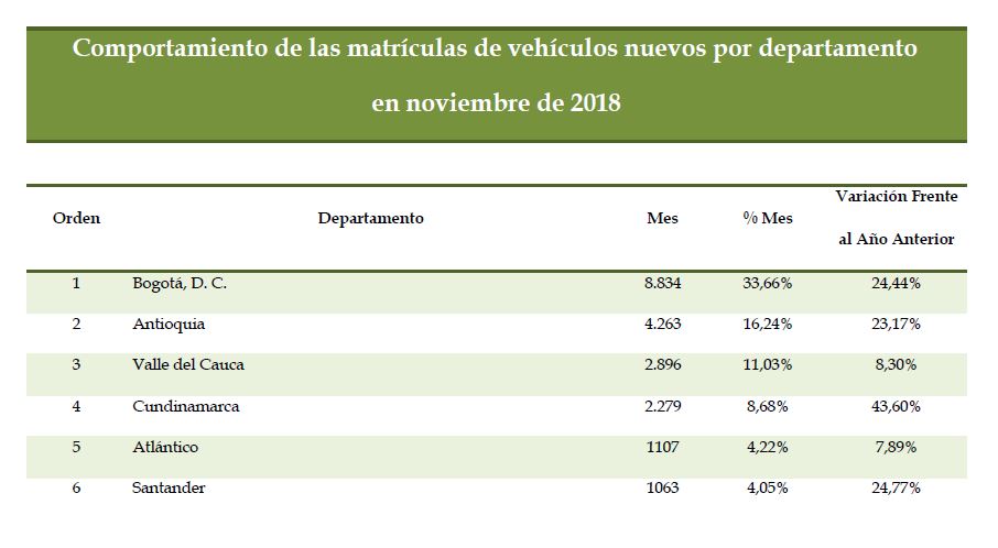Bogotá, D. C., consolidó su participación en matrículas en un 32.0% en lo que va corrido de 2018, los departamentos de Antioquia con el 16,9% del mercado, Valle del Cauca con el 12,1%, Cundinamarca con el 8,5% y Atlántico con el 4,3%, ocuparon los siguientes lugares en matrículas; estos cinco departamentos representaron el 73,8% del total de los vehículos matriculados en este período. Respecto al acumulado a noviembre del año anterior, entre los cinco primeros departamentos, Cundinamarca, Antioquia y Valle del Cauca aumentaron 25,8%, 7,9% y 0,4%, en tanto que Atlántico y Bogotá, D. C. disminuyeron -2,4% y -0.9%, respectivamente.