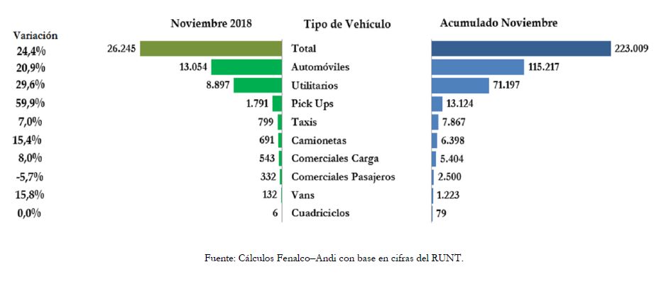 Por tercer mes consecutivo el sector ha presentado un incremento. En el mes de noviembre se destaca un crecimiento del 24,4% respecto del mismo mes del 2017, lo que reafirma la proyección de Fenalco y Andi de superar el umbral de 250.000 unidades al culminar el año.