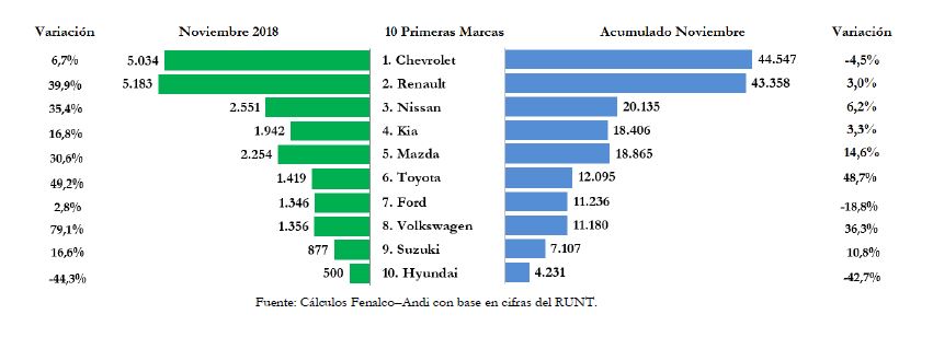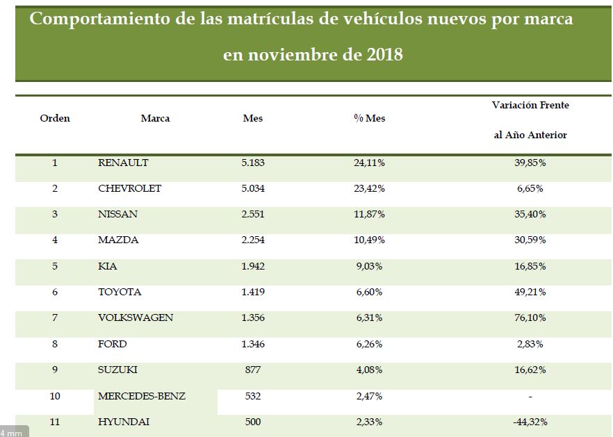 Las cinco marcas con mayor número de matrículas acumuladas de enero a noviembre, fueron Chevrolet, Renault, Nissan, Kia y Mazda, con participaciones de mercado de 20,0%, 19,4%, 9,0%, 8,3% y 8,5%, respectivamente, que representaron el 65,2% del total de los vehículos matriculados en este período. En relación con el mismo período del año anterior, entre las cinco primeras marcas, Mazda, Nissan, Kia y Renault aumentaron 14,6%, 6,2%, 3,3% y 3,0%, en tanto que Chevrolet dismunuyó su participación en -4,5%.