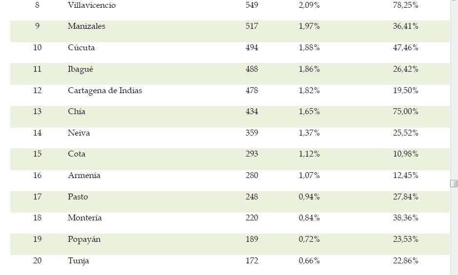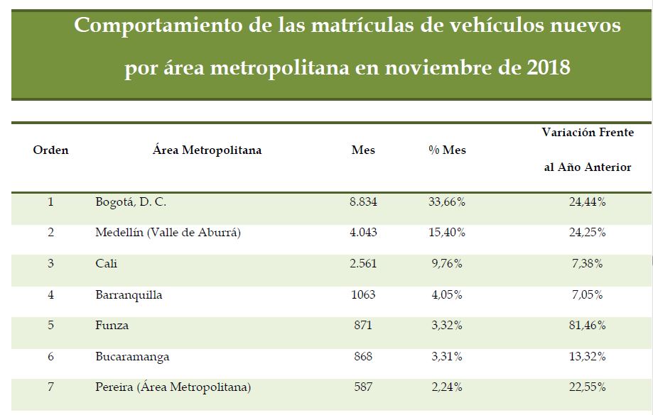En los once primeros meses del año, las cinco ciudades y sus áreas metropolitanas con mayor número de vehículos matriculados fueron Bogotá, D. C., Medellín (y el área metropolitana del Valle de Aburrá), Cali, Barranquilla y Bucaramanga, con participaciones de mercado de 32,0%, 16,0%, 10,7%, 4,1% y 3,5%, respectivamente, que en conjunto representaron el 66,2% del mercado nacional. Frente a los once primeros meses del año anterior, entre las cinco primeras ciudades y sus áreas metropolitanas, Medellín (Valle de Aburrá) y Cali aumentaron en un 8,4% y 0,5%, respectivamente; en tanto que Barranquilla, Bogotá D. C., y Bucaramanga disminuyeron -2,3%, -0,9% y -0,8%, respectivamente.