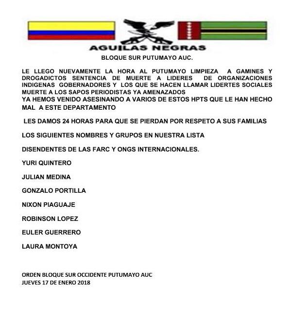En el panfleto que circuló el 17 de enero amenazan a líderes de organizaciones indígenas, gobernadores indígenas y periodistas. Los blancos de las amenazas son Yuri Quintero (diputada de la Asamblea Departamental de Putumayo, que había sido amenazada en junio de 2018), Julián Medina, Gonzalo Portilla (comunicador social de Putumayo), Nixon Piaguaje (indígena siona y periodista de la emisora radio Waira), Robinson López (indígena inga y coordinador de derechos humanos de la Organización de los Pueblos Indígenas de la Amazonía Colombiana (OPIAC), Euler Guerrero (diputado de la Asamblea Departamental de Putumayo) y Laura Montoya (comunicadora social putumayense).