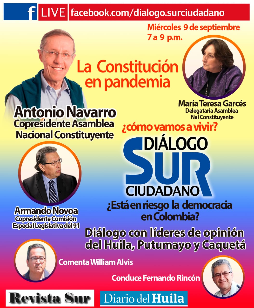 A propósito del documento, que suscribió junto con otros delegatarios de esa Asamblea Constituyente y varios académicos y dirigentes políticos denunciado ese hecho, va a participar en un nuevo Diálogo Surciudadano en línea con líderes de opinión de la región y el respaldo del Diario del Huila a las 7 de la noche de hoy. Se puede seguir en Facebook.com/dialogo.surciudadano hoy miércoles 9 de septiembre entre las 7 y las 9 p.m..