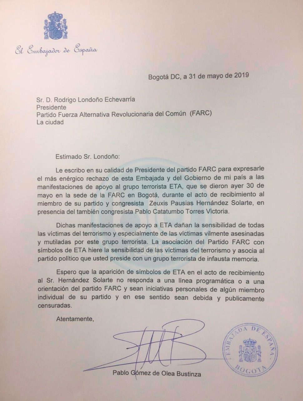 “Le escribo en su calidad de presidente del partido Farc para expresarle el más enérgico rechazo de esta embajada y del gobierno de mi país a las manifestaciones de apoyo al grupo terrorista ETA, que se dieron ayer, 30 de mayo, en la sede de la Farc en Bogotá”, dice la misiva.