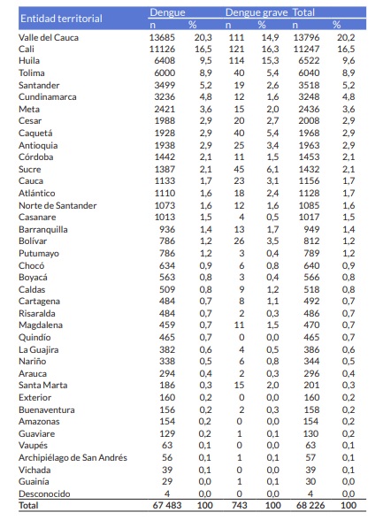 Durante el 2020 se han notificado 138 muertes probables por dengue, de las cuales 41 han sido confirmadas procedentes de: Valle del Cauca, con 10 casos; Huila, con 5 casos, Santander y Tolima, con 4 casos cada uno; Cali y Cesar, con 3 casos cada uno; Atlántico y Cauca, con 2 casos cada uno; Caldas, Cartagena, Córdoba, Cundinamarca, Magdalena, Meta, Norte de Santander y Santa Marta, con 1 caso cada uno. Se han descartado 48 casos y se encuentran en estudio 49 muertes procedentes de: Cali, con 9 casos; Valle del Cauca, con 8 casos; Cartagena y Sucre, con 4 casos cada uno; Córdoba, con 3 casos; Atlántico, Barranquilla, Bolívar, Caquetá, Cundinamarca y Santa Marta, con 2 casos cada uno; y Antioquia, Buenaventura, Caldas, Cauca, Chocó, Guainía, Magdalena, Santander y Tolima, con 1 caso respectivamente.