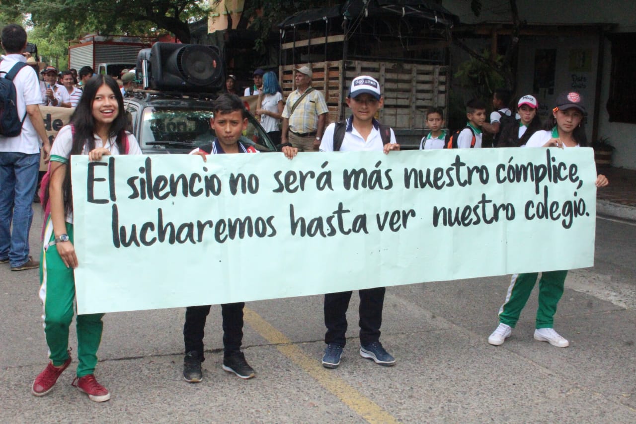 Una lucha que no cesa. Estudiantes, padres de familia y docentes de la Institución Educativa Santa Rita, se trasladaron desde Aipe hacia Neiva, exigiendo se dé inicio a la culminación de las obras de la sede central de dicho colegio.