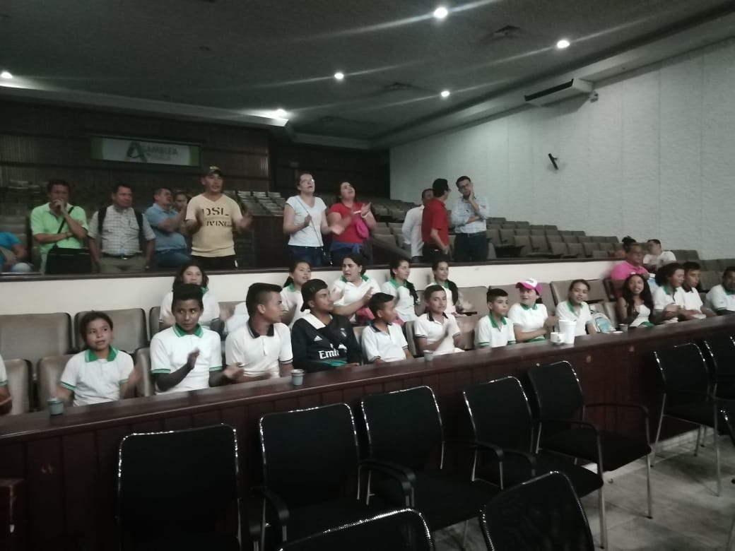 Estudiantes, padres de familia y docentes de la Institución Educativa Santa Rita, en la Asamblea del Huila hoy en horas de la noche.