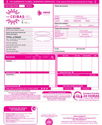 Las Ceibas Empresas Públicas de Neiva E.S.P, en convenio con la Alcaldía de Neiva se vinculan a la conmemoración del Día Internacional de la Mujer. En el mes de marzo las facturas serán de color rosado.