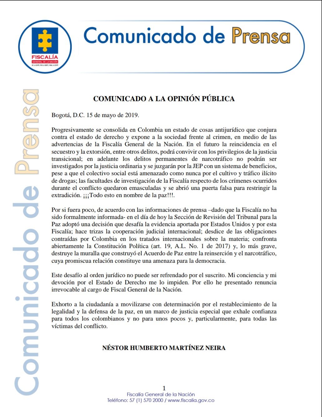 "Esta decisión de la JEP no será refrendada y por eso he tomado la decisión de presentar mi renuncia como Fiscal General de la Nación" dijo en su intervención Néstor Humberto Martínez.