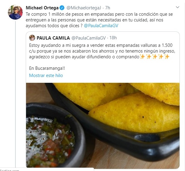 Minutos después el mismo Michael Ortega desde su cuenta respondió, “Te compro un millón de pesos en empanadas, pero con la condición de que se entreguen a las personas que están necesitadas en tu ciudad. Así nos ayudamos todos: ¿Qué dices?”. Esta no es la primera vez que el futbolista toma iniciativas de esta índole, ya lo ha hecho en otras ocasiones con otra serie de ayudas.