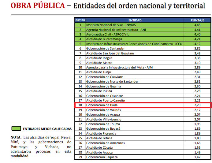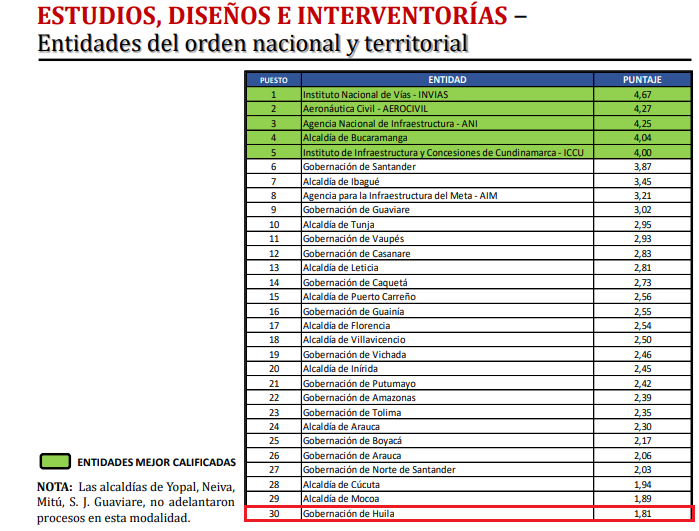La Gobernación del Huila ocupó el último lugar en, Estudios, Diseños e Interventorías dentro de las entidades del orden nacional y territorial.