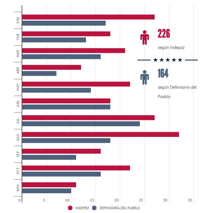 En lo que va del 2019, han sido asesinados 5 líderes sociales según el Ministerio del Interior, pero de acuerdo a otras fuentes extraoficiales la cifra sube a 7. Según informe de la Fundación Ideas para la Paz, que evaluó los primeros 100 días del Gobierno de Iván Duque, asegura que al comparar los tres primeros meses del nuevo gobierno (agosto a octubre de 2018) con el mismo periodo del año anterior, se evidencia que las agresiones a líderes sociales se triplicaron y los homicidios se duplicaron.
