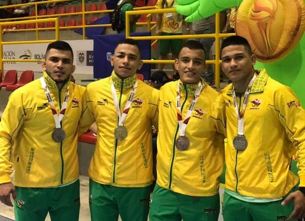 - (Izquierda a derecha) Hernán Darío Guzmán Ipuz plata, Arbey Alarcón, Kevin Perdomo bronce y Diego Díaz medalla de plata en lucha.