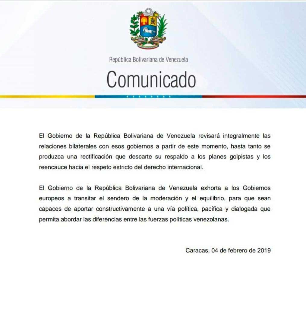 A través de un comunicado de su Cancillería, el Gobierno de Maduro señaló que la revisión de las relaciones comienza "a partir de este momento" y hasta tanto se produzca en estas naciones "una rectificación que descarte su respaldo a los planes golpistas y los reencauce hacia el respeto irrestricto del derecho institucional".
