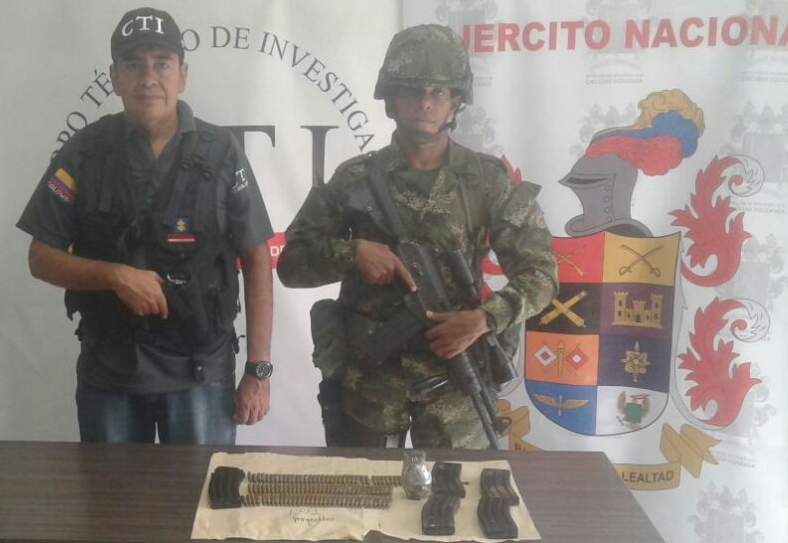 En el lugar fue encontrado oculto una maleta de fibra con cinco proveedores para fusil, 101 cartuchos 5.56 milímetros, una granada de mano IM – 26 y cinco metros de cordón detonante.
