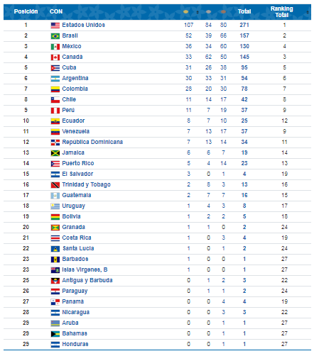 Al día de hoy domingo Colombia ha conseguido 28 medallas de oro, 20 de plata y 30 de bronce para un total de 78 medallas, superando lo realizado en el 2015 en Toronto, Canadá, cuando la tricolor obtuvo el quinto lugar con 27 medallas de oro, 14 de plata y 31 de bronce para un total de 72 preseas.