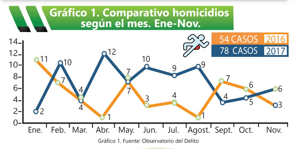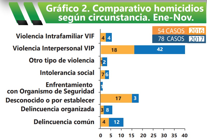 En julio del 2017 se había registrado una disminución de homicidios, en octubre empezó un leve aumento de los casos respecto al año 2016. Sin embargo, la tasa por cada 100.000 habitantes se estableció en 22.55%, por debajo de la media nacional.