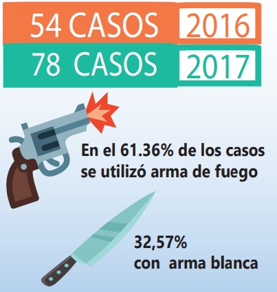 Respecto a las causales identificadas en provocar los asesinatos, se tuvo en primer lugar la violencia interpersonal con 42 casos en el año pasado y 18 crimines en el 2016. La delincuencia común cometió en el año 2017, 12 asesinatos y cuatro en el año 2016.