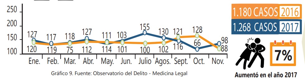 Para este tipo de delito se identificaron en el 2016, 152 situaciones y en el 2017, 218, por lo tanto hubo un aumento en un 43%. Sin embargo, en los meses de septiembre, octubre y noviembre de 2017se presentó una disminución.