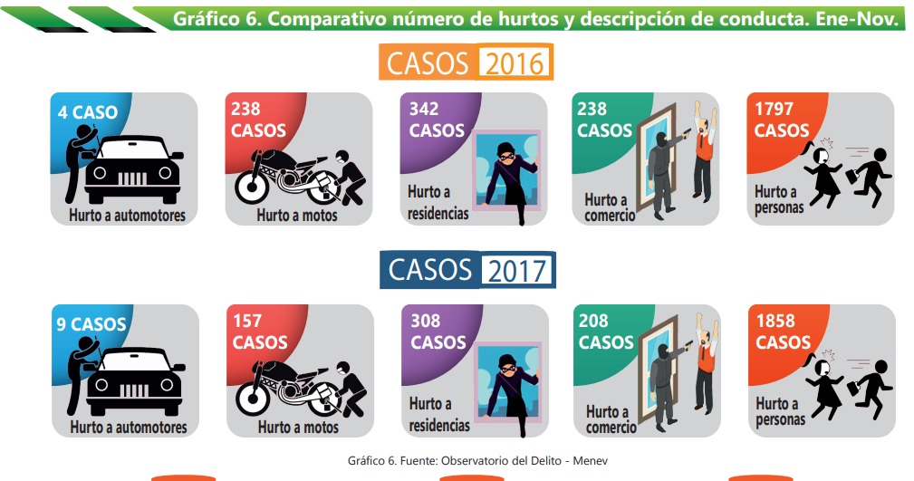 En el 2016 se presentaron cuatro casos de hurto a automotores y nueve en el 2017. El hurto de motos tuvo una disminución, ya que 238 situaciones se evidenciaron en el 2016 y el año pasado 157. Hurto a residencias en el 2016 fueron 342 y el 2017, 308. Respecto al hurto a comercio se reportaron 238 casos en el 2016 y 208 para el año que culminó.