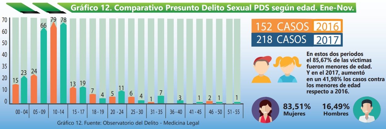 En este tipo de violencia las edades que presentaron un número elevado de casos fue entre 5 a 9 años, para el 2016 se evidenciaron 24 casos y en el 2017, 66. Igualmente entre 10 a 14 años tuvieron un numero casi igual, ya que en 2016 se presenciaron 79 y en el 2017, 78 casos. En estos dos periodos el 85,67% de las víctimas fueron menores de edad.
